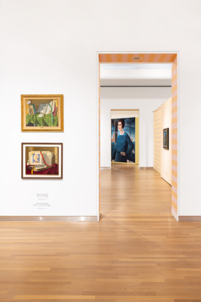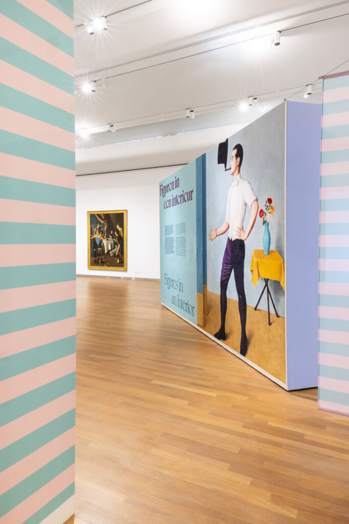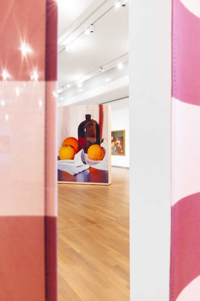 Kleur werd een belangrijk middel, gebaseerd op de werken zelf, waardoor het geheel vanzelf samenhang krijgt. Grote blow-ups op velours, transparante lagen en subtiele verwijzingen naar de Italiaanse beeldtaal zorgen voor ritme in de zalen, zonder dat het geforceerd aanvoelt. Het is geen schreeuwerig ontwerp, maar iets wat je gaandeweg ontdekt.