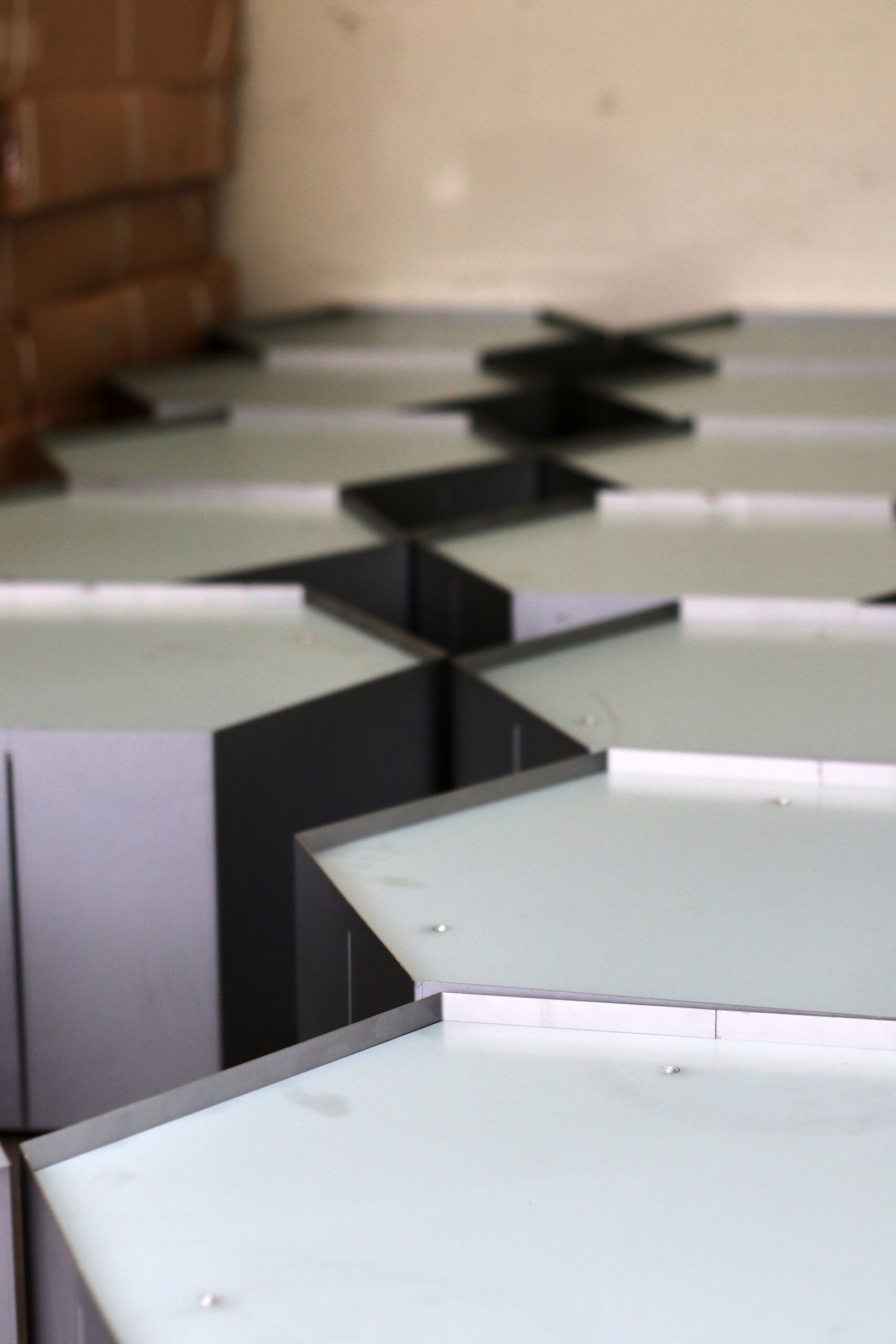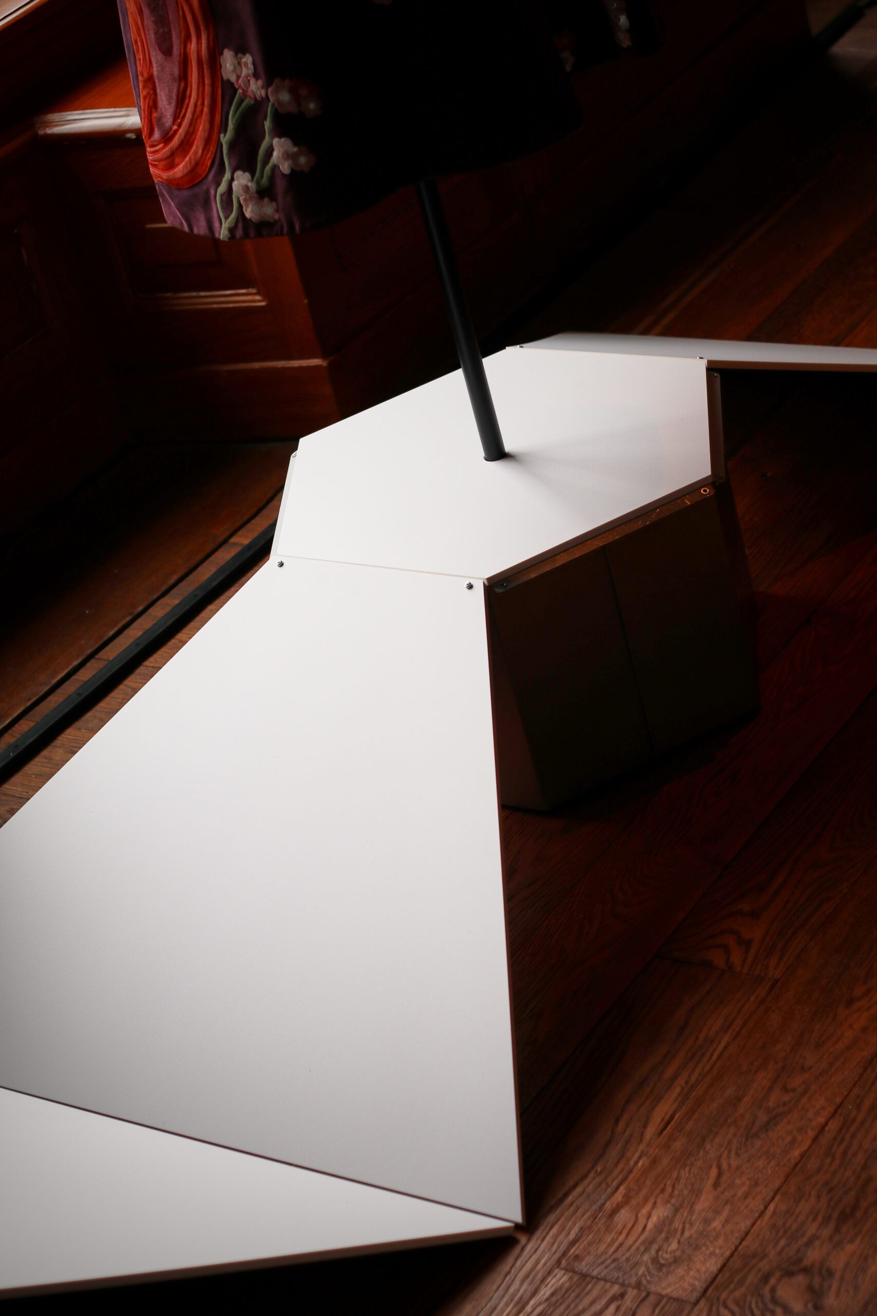 Studio met met werkte met een modulair systeem: de sokkels kunnen zowel los als aan elkaar worden gebruikt, waardoor de opstelling flexibel is en gemakkelijk aan te passen aan de ruimte.