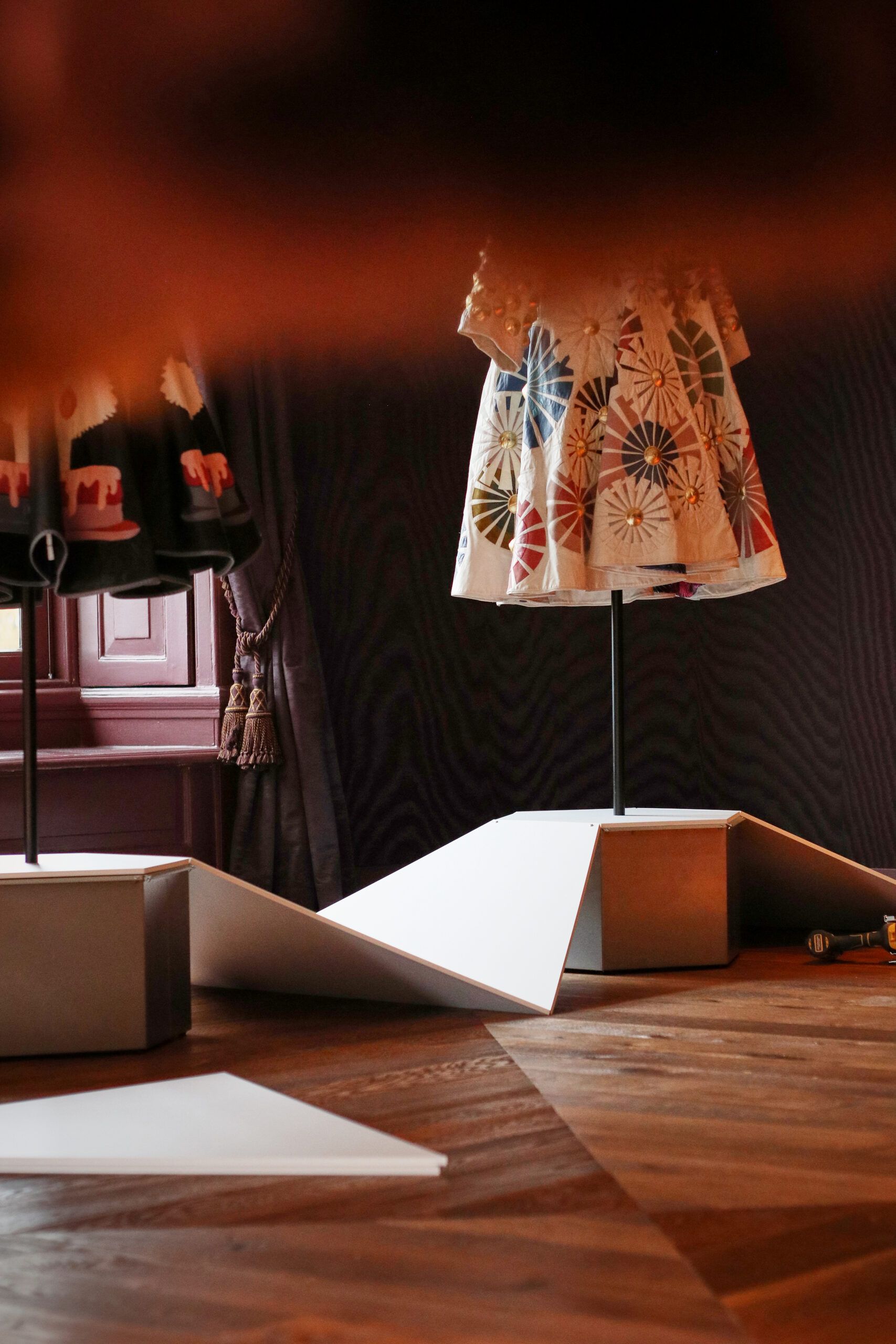 De kledingstukken zijn geplaatst op speciaal ontworpen voetstukken die ervoor zorgen dat bezoekers de stukken niet aanraken, maar die tegelijk de overgang naar het drukke interieur van het kasteel verzachten.